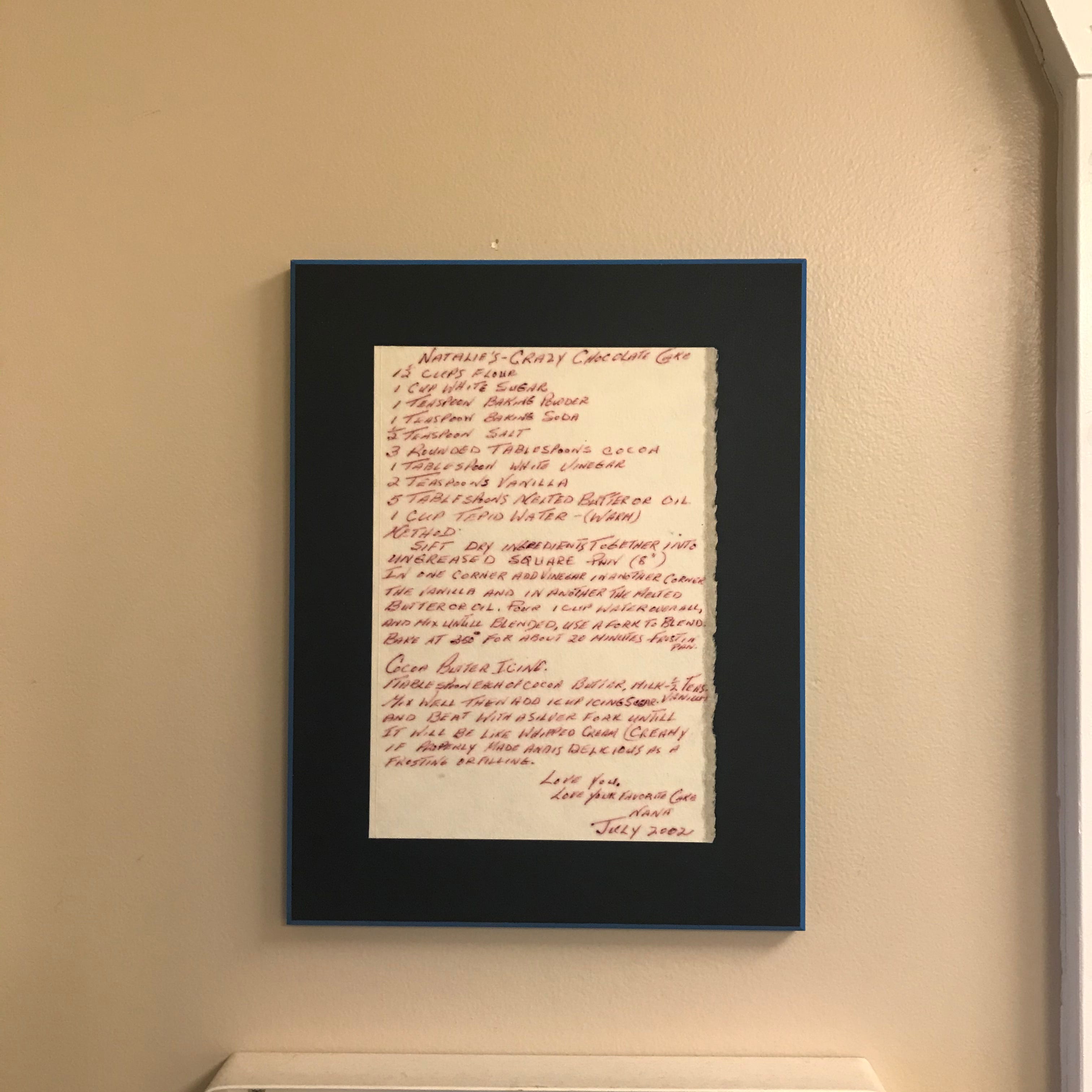 Michelle and I finally finished hanging our collection of art recently (I know, we’ve been here for…many moons), and among the additions was a handwritten cake recipe mounted on a plaque. My nana gave it to me almost 20 years ago while we celebrated our birthdays together as we often did, a day apart at the end of July. She passed away a few years ago and I’ve since inherited a few of her things, including her cookbook.